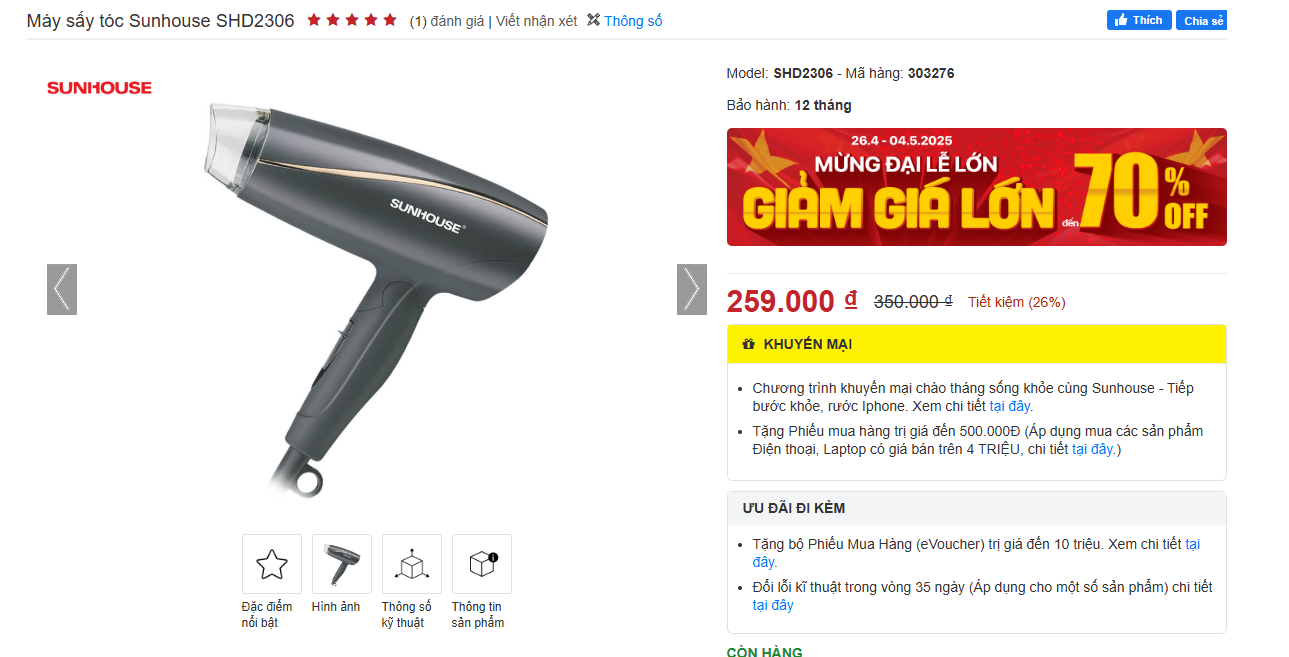 Một máy sấy tóc Sunhouse 259,000 đồng sẽ được tặng cho bạn khách hàng đầu tiên kiếm đủ 2590 đồng vàn...