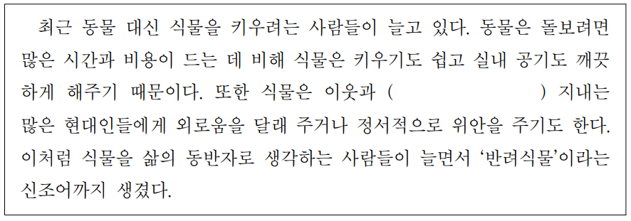 최근 동물 대신 식물을키우려는사람들이 늘고있다.동물은 돌보려면 많은시간과비용이드는데비해 식물은 키우기도쉽고 실내 공기도 깨끗하게해주기때문이다.또한 식물은 이웃과 ( )지내는많은현대인들에게 외로움을달래주거나 정서적으로 위안을주기도한다.이처럼 식물을삶의동반자로생각하는사람들이 늘면서 ‘반려식물’이라는신조어까지 생겼다.