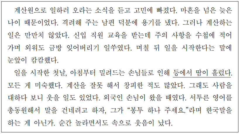 계산원으로 일하러오라는소식을 듣고 고민에빠졌다.마흔을넘은늦은나이때문이었다.격려해주는남편덕분에 용기를냈다.그러나 계산하는일은 만만치않았다.신입 직원 교육을받는데 주의 사항을 수첩에적어가며외워도금방잊어버리기일쑤였다.며칠 뒤 일을시작한다는말에 눈앞이 캄캄했다. 일을시작한첫날,아침부터 밀려드는손님들로인해 등에서 땀이 흘렀다. 모든게 미숙했다.계산을 잘못해서창피한적도많았다.그래도 사람을대하다보니웃을일도있었다.외국인 손님이 왔을때였다.서투른영어를 총동원해서 말을건네려고하자,그가 “봉투하나주세요.”라며 한국말을하는게아닌가.순간 놀라면서도 속으로 웃음이났다.