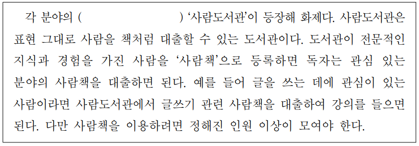 각 분야의 ( )‘사람도서관’이 등장해 화제다.사람도서관은 표현 그대로 사람을책처럼대출할수있는도서관이다.도서관이 전문적인지식과 경험을가진사람을 ‘사람책’으로 등록하면 독자는관심있는분야의 사람책을 대출하면된다.예를들어 글을쓰는데에관심이있는사람이라면 사람도서관에서 글쓰기 관련 사람책을 대출하여 강의를 들으면된다.다만 사람책을 이용하려면 정해진인원 이상이 모여야한다.Câu 30.