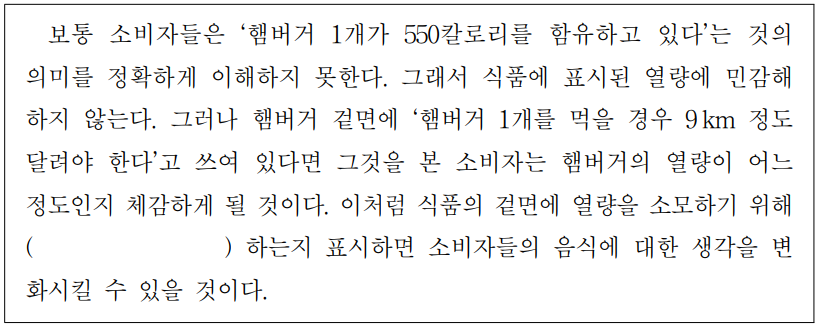 보통 소비자들은 ‘햄버거1개가550칼로리를함유하고있다’는것의의미를 정확하게 이해하지못한다.그래서 식품에 표시된열량에 민감해하지않는다.그러나 햄버거 겉면에 ‘햄버거1개를먹을경우9km정도달려야한다’고쓰여있다면 그것을 본소비자는 햄버거의 열량이 어느 정도인지 체감하게될것이다.이처럼 식품의 겉면에 열량을 소모하기위해 ( )하는지 표시하면 소비자들의 음식에대한생각을 변화시킬수있을것이다.31.