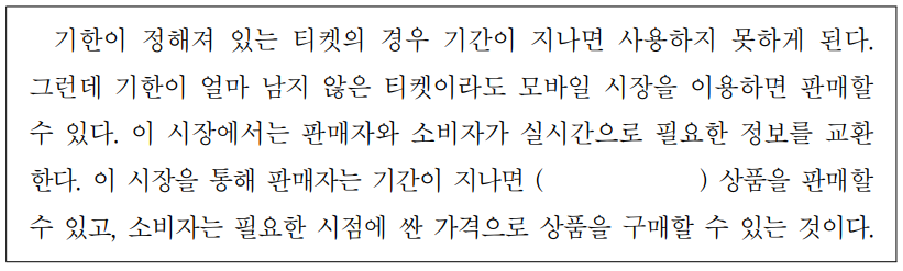 기한이정해져있는티켓의 경우 기간이 지나면 사용하지못하게된다. 그런데 기한이얼마남지않은티켓이라도 모바일 시장을 이용하면 판매할수있다.이 시장에서는 판매자와 소비자가 실시간으로 필요한정보를 교환한다.이 시장을 통해 판매자는 기간이 지나면 ( )상품을 판매할수있고,소비자는 필요한시점에 싼가격으로 상품을 구매할수있는것이다.※ [32~34]다음을 읽고 내용과같은것을 고르십시오.(각 2점)
