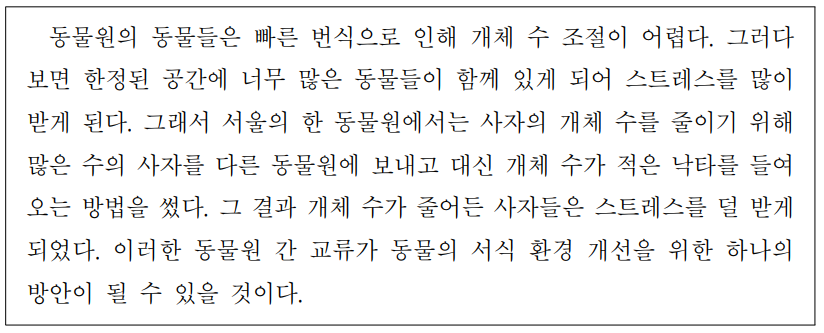 동물원의 동물들은 빠른번식으로인해 개체 수 조절이 어렵다.그러다보면 한정된공간에 너무 많은동물들이 함께 있게되어 스트레스를 많이 받된다.그래서 서울의 한 동물원에서는사자의 개체 수를 줄이기위해 많은수의 사자를 다른동물원에 보내고 대신 개체수가적은낙타를들여오는방법을 썼다.그 결과 개체수가줄어든사자들은 스트레스를 덜 받게되었다.이러한동물원 간 교류가 동물의서식환경개선을위한하나의방안이 될수있을것이다.33.