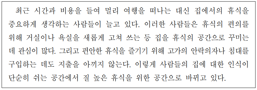최근 시간과비용을들여 멀리여행을떠나는대신 집에서의 휴식을중요하게생각하는사람들이 늘고있다.이러한사람들은 휴식의편의를위해 거실이나욕실을새롭게고쳐쓰는등 집을 휴식의 공간으로 꾸미는데관심이 많다.그리고 편안한휴식을 즐기기위해 고가의안락의자나침대를구입하는데도 지출을 아끼지않는다.이렇게 사람들의 집에대한인식이 단순히 쉬는공간에서 질높은휴식을위한공간으로 바뀌고있다.34.