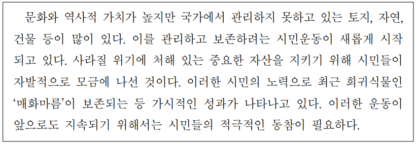 문화와 역사적 가치가 높지만 국가에서관리하지못하고있는토지,자연,건물등이 많이 있다.이를관리하고보존하려는시민운동이새롭게시작되고있다.사라질위기에 처해있는중요한자산을 지키기위해 시민들이 자발적으로 모금에 나선것이다.이러한시민의 노력으로 최근 희귀식물인‘매화마름’이보존되는등가시적인성과가 나타나고있다.이러한운동이 앞으로도 지속되기위해서는 시민들의적극적인동참이 필요하다.※ [35~38]다음 글의 주제로 가장 알맞은것을 고르십시오.(각 2점)