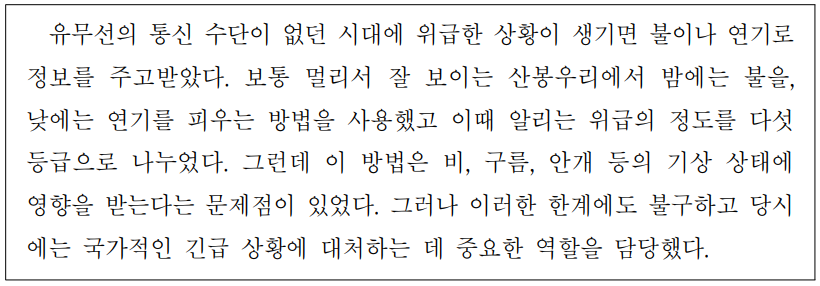 유무선의통신수단이없던시대에 위급한상황이 생기면 불이나 연기로 정보를 주고받았다.보통 멀리서잘보이는산봉우리에서 밤에는불을,낮에는연기를피우는방법을 사용했고 이때 알리는위급의 정도를 다섯 등급으로 나누었다.그런데 이 방법은 비,구름,안개 등의 기상 상태에 영향을받는다는문제점이 있었다.그러나 이러한한계에도불구하고 당시에는 국가적인긴급 상황에대처하는데 중요한역할을 담당했다.Câu 36.