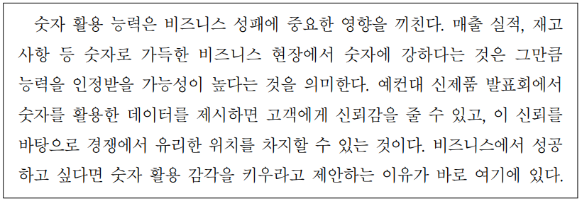 숫자 활용 능력은 비즈니스 성패에 중요한영향을끼친다.매출 실적,재고 사항 등 숫자로 가득한비즈니스 현장에서 숫자에강하다는것은 그만큼능력을인정받을가능성이높다는것을 의미한다.예컨대 신제품 발표회에서 숫자를 활용한데이터를 제시하면 고객에게 신뢰감을 줄수있고,이 신뢰를 바탕으로 경쟁에서 유리한위치를차지할수있는것이다.비즈니스에서 성공하고싶다면 숫자활용감각을키우라고제안하는이유가 바로 여기에 있다.Câu 37.