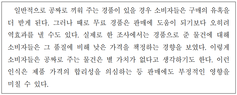 일반적으로 공짜로 끼워주는경품이 있을경우 소비자들은 구매의 유혹을 더 받게된다.그러나 때로 무료 경품은 판매에도움이되기보다 오히려 역효과를 낼수도있다.실제로 한 조사에서는 경품으로 준물건에대해 소비자들은 그 품질에비해 낮은가격을책정하는경향을 보였다.이렇게 소비자들은 공짜로 주는물건은 별가치가없다고생각하기도한다.이런 인식은 제품 가격의 합리성을 의심하는등 판매에도 부정적인영향을 미칠수있다.※ [39~41]다음 글에서 <보기>의 문장이 들어가기에 가장 알맞은곳을 고르십시오.(각 2점)
