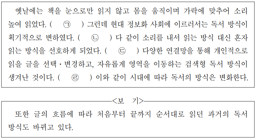 옛날에는 책을 눈으로만 읽지않고 몸을 움직이며 가락에 맞추어 소리 높여읽었다.( ㉠ )그런데 현대 정보화 사회에 이르러서는 독서 방식이 획기적으로 변하였다.( ㉡ )다같이 소리를내서읽는방식 대신 혼자 읽는방식을 선호하게되었다.( ㉢ )다양한연결망을 통해 개인적으로 읽을 글을 선택․변경하고,자유롭게 영역을 이동하는검색형 독서 방식이 생겨난것이다.( ㉣ )이와같이 시대에따라 독서의 방식은 변화한다.