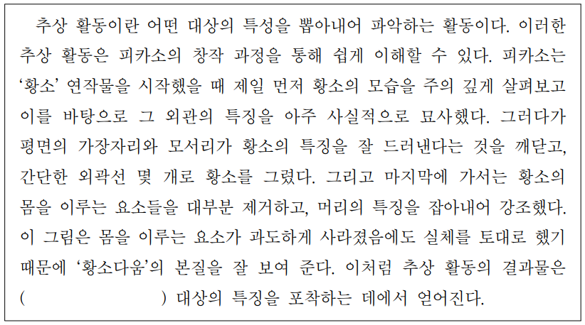 이 그림은 몸을 이루는요소가 과도하게 사라졌음에도 실체를 토대로 했기때문에 ‘황소다움’의 본질을 잘 보여준다.이처럼 추상 활동의 결과물은 ( )대상의특징을포착하는데에서 얻어진다.