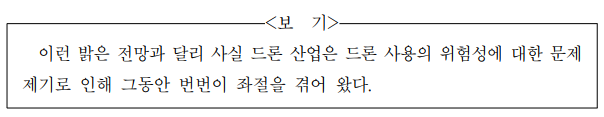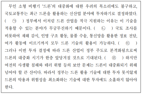 무인소형비행기‘드론’의대중화에대한우려의목소리에도불구하고, 국토교통부는 최근 드론을활용하는신산업분야에 투자하기로결정하였다. ( ㉠ )정부에서 이처럼 드론산업을적극지원하는이유는 이기술을적용할수있는분야가무궁무진하기때문이다.( ㉡ )국토 조사를 비롯하여 재해 감시,인명 구조 활동,물품 수송,통신망을활용한정보전달,여가활동에이르기까지 모두 드론 기술의 활용이 가능하다.( ㉢ ) 그러나 이번 투자 결정에따라 드론 산업이 정부 주도로 본격화됨으로써 드론의대중화시기가한층앞당겨질것으로기대된다.( ㉣ )하지만 여전히 사생활 침해와 테러 위험 등의 보안 문제는 드론이대중화되기위해 넘어야할큰산이다.따라서 정부는 드론활용기술에대한투자 못지않게 드론의 악용과위험성을최소화하는기술에대한투자에도 소홀하지않아야한다.