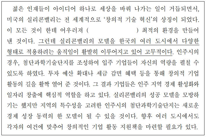 젊은인재들이아이디어하나로세상을바꿔나가는일이 거듭되면서, 미국의 실리콘밸리는 전세계적으로 ‘창의적 기술 혁신’의 상징이되었다. 이 모든것이 한데 어우러져 ( )최적의환경을만들어낸것이다. 그런데 실리콘밸리의모델을한국의여러도시에서다양한형태로적용하려는움직임이 활발히 이루어지고있어 고무적이다.인주시의 경우,첨단과학기술단지를 조성하여 입주 기업들이 자신의 역량을 펼칠수있도록하였다.투자 예산 확대나 세금 감면 혜택 등을 통해 창의적기업활동의길을활짝열어준것이다.그 결과 기업들은 인주 지역 경제 활성화와 일자리 창출에 핵심적 역할을하고있다.실리콘밸리의 성공 모델을 모방하기는했지만 지역의특수성을고려한인주시의첨단과학기술단지는 새로운경제 성장 동력의 한 모델이될수있을것이다.향후 여러 도시에서도 각자의 여건에 맞추어 창의적인기업활동지원책을마련할필요가있다.