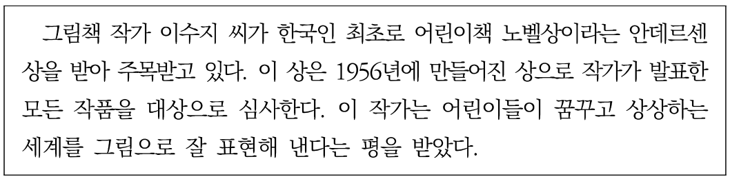 다음 글 또는 그래프의 내용과같은것을 고르십시오. Chọn nội dung đúng với bài viết hoặc biểu đồ sau. 그림책 작가 이수지 씨가 한국인최초로 어린이책노벨상이라는안데르센상을 받아 주목받고있다. 이 상은 1956년에만들어진상으로 작가가발표한모든작품을 대상으로 심사한다. 이 작가는 어린이들이꿈꾸고상상하는세계를 그림으로잘표현해낸다는평을 받았다.
