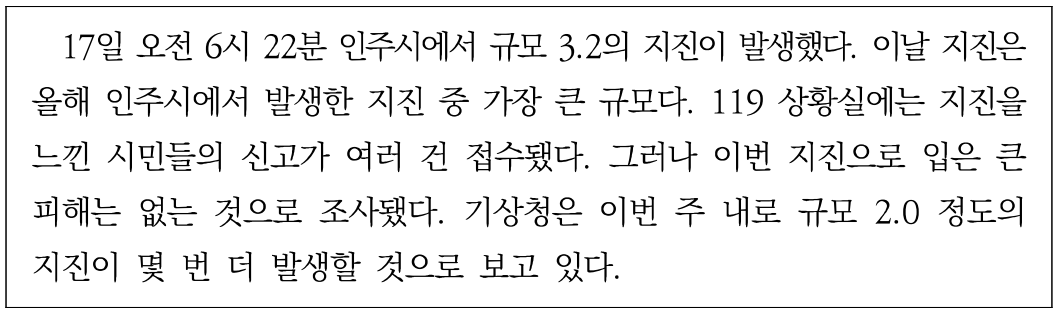 다음 글 또는 그래프의 내용과같은것을 고르십시오. Chọn nội dung đúng với bài viết hoặc biểu đồ sau. 17일 오전 6시 22분 인주시에서 규모 3.2의 지진이 발생했다. 이번 지진은 올해인주시에서발생한지진중가장큰규모다. 119 상황실에는 지진을느낀시민들의 신고가 여러 건 접수됐다. 그러나 이번 지진으로입은큰피해는없는것으로 조사됐다. 기상청은 이번주내로 규모 2.0 정도의 지진이 몇번 더발생할것으로보고있다.