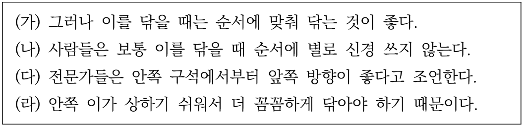 다음을 순서에 맞게 배열한것을 고르십시오. Chọn câu sắp xếp đúng thứ tự. (가) 그러나 이를닦을때는 순서에맞춰닦는것이좋다.