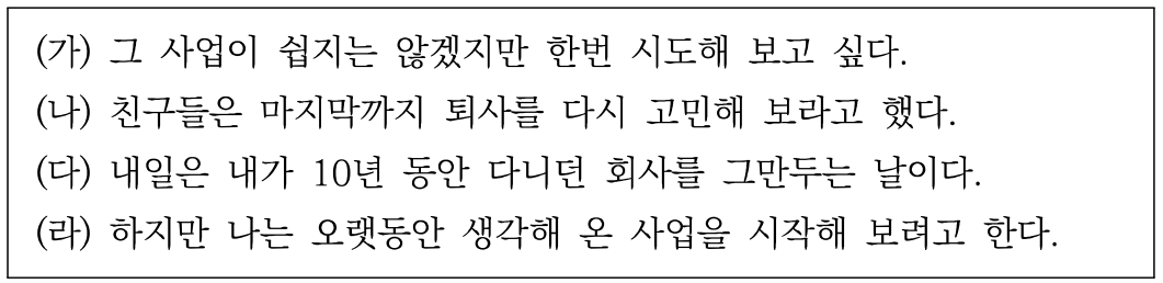 다음을 순서에 맞게 배열한것을 고르십시오. Chọn câu sắp xếp đúng thứ tự. (가) 그사업이쉽지는않겠지만 한번시도해보고싶다.