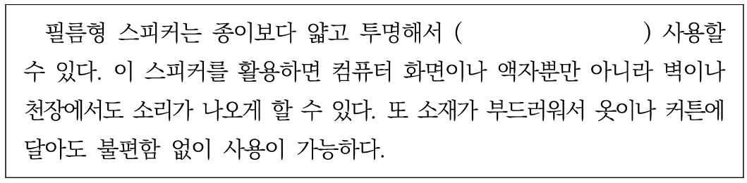 ( )에 들어갈말로 가장 알맞은것을 고르십시오. Chọn cái phù hợp điền vào ( ). 필름형스피커는 종이보다 얇고투명해서 ( ) 사용할수있다. 이스피커를 활용하면 컴퓨터 화면이나 액자뿐만아니라 벽이나 천장에서도 소리가나오게할수있다. 또 소재가부드러워서 옷이나 커튼에 달아도 불편함없이 사용이 가능하다.