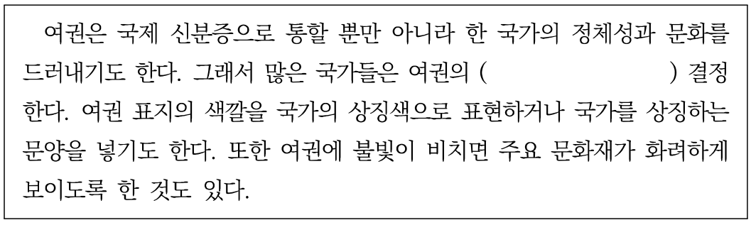 ( )에 들어갈말로 가장 알맞은것을 고르십시오. Chọn cái phù hợp điền vào ( ). 여권은 국제 신분증으로 통할뿐만아니라 한 국가의 정체성과 문화를 드러내기도한다. 그래서 많은국가들은 여권의 ( ) 결정한다. 여권표지의 색깔을 국가의 상징색으로 표현하거나 국가를상징하는문양을 넣기도한다. 또한 여권에 불빛이 비치면 주요문화를화려하게보이도록한것도있다.