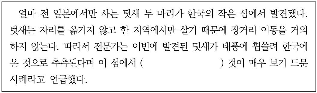 ( )에 들어갈말로 가장 알맞은것을 고르십시오. Chọn cái phù hợp điền vào ( ). 얼마전 일본에서만사는텃새두마리가 한국의작은섬에서발견됐다. 텃새는 자리를 옮기지않고 한 지역에서만 살기때문에 장거리 이동을 거의하지않는다. 따라서 전문가는 이번에발견된텃새가 태풍에휩쓸려한국에온것으로추측된다며 이 섬에서 ( ) 것이 매우보기드문사례라고언급했다.