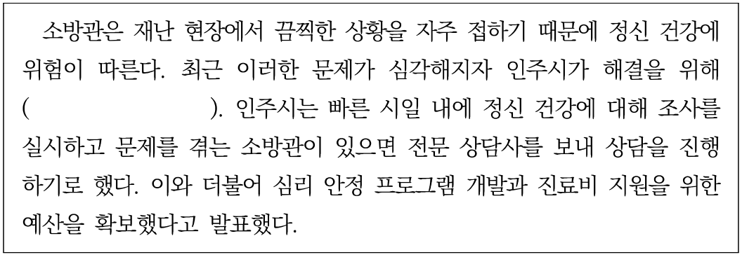 ( )에 들어갈말로 가장 알맞은것을 고르십시오. Chọn cái phù hợp điền vào ( ). 소방관은 재난현장에서끔찍한상황을자주접하기때문에 정신 건강에 위험이 따른다. 최근 이러한 문제가 심각해지자 인주시가 해결을 위해 ( ). 인주시는 빠른시일내에 정신건강에대해 조사를 실시하고 문제를겪는소방관이있으면 전문 상담사를 보내 상담을 진행하기로했다. 이와 더불어 심리 안정 프로그램 개발과 진료비 지원을 위한 예산을 확보했다고발표했다.