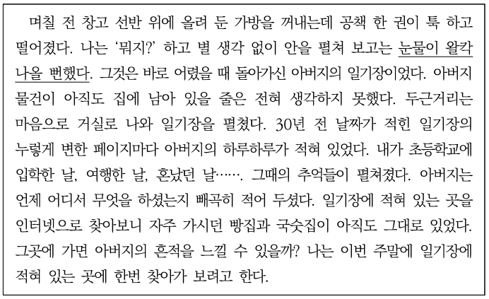 윗글의 내용과같은것을 고르십시오. Chọn nội dung đúng của bài viết. 며칠 전 창고 선반위에올려둔가방을꺼내는데 공책 한 권이 툭하고떨어졌다. 나는 “뭐지?” 하고 별생각없이 안을펼쳐보고는 눈물이 왈칵나올뻔했다. 그것은 바로 어렸을때돌아가신아버지의 일기장이었다. 아버지의 물건이 아직도 집에 남아있을줄은 전혀 생각하지못했다. 두근거리는 마음으로 거실로 나와 일기장을 펼쳤다. 30년전날짜가적힌일기장의 누렇게변한페이지마다 아버지의 하루하루가 생생히 적혀있었다. 내가 초등학교에 입학한날, 여행한날, 혼났던날…… 그때의 추억들이 펼쳐졌다. 아버지는 언제어디서무엇을하셨는지 빼곡히 적어두셨다. 일기장에적혀있는곳을 인터넷으로 찾아보니 자주가시던빵집과국숫집이 아직도 그대로 있었다. 그것에 가면 아버지의 흔적을 느낄수있을까? 나는 이번 주말에 일기장에적혀있는곳에 한번 찾아가보려고한다.