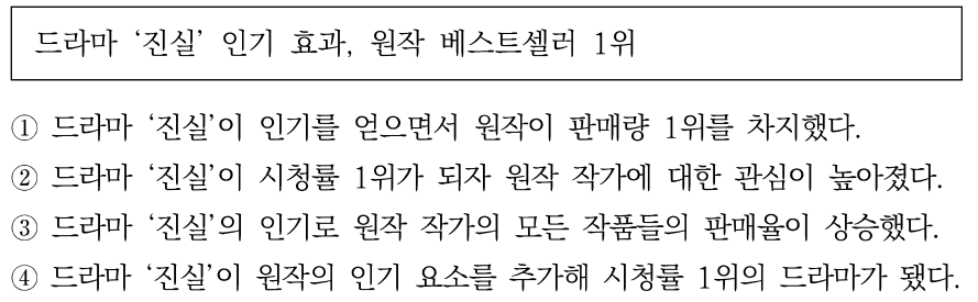 다음 신문 기사의 제목을 가장 잘 설명한것을 고르십시오. Chọn giải thích đúng nhất cho tiêu đề bài báo dưới đây. 드라마 ‘진심’ 인기 효과, 원작 베스트셀러 1위