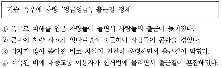 다음 신문 기사의 제목을 가장 잘 설명한것을 고르십시오. Chọn giải thích đúng nhất cho tiêu đề bài báo dưới đây. 기습 폭우에 차량 ‘엉금엉금’, 출근길 정체