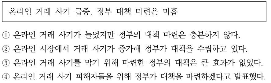 다음 신문 기사의 제목을 가장 잘 설명한것을 고르십시오. Chọn giải thích đúng nhất cho tiêu đề bài báo dưới đây. 온라인 거래 사기 급증, 정부 대책 마련은 미흡
