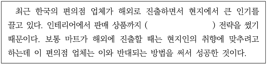 ( )에 들어갈말로 가장 알맞은것을 고르십시오. Chọn cái phù hợp nhất điền vào ( ). 최근 한국의 편의점 업체가 해외로 진출하면서 현지에서큰인기를끌고있다. 인터넷에서의 판매 상품까지 ( ) 전략을 썼기때문이다. 보통 마트가 해외에 진출할때는 현지인의 취향에 맞추려고하는데 이 편의점 업체는 이와반대되는방법을 써서 성공한것이다.