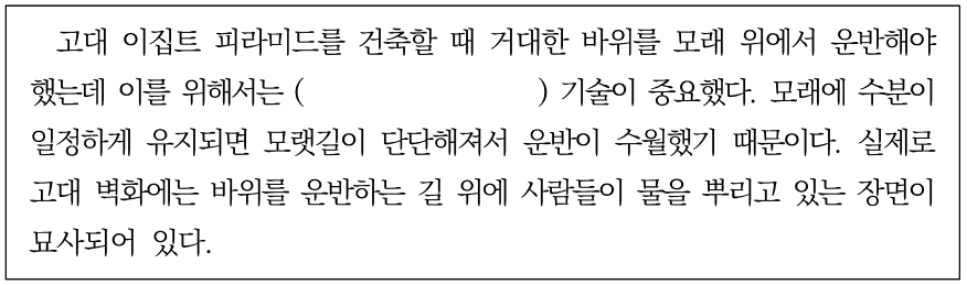 ( )에 들어갈말로 가장 알맞은것을 고르십시오. Chọn cái phù hợp nhất điền vào ( ). 고대 이집트 피라미드를 건축할때 거대한바위를 모래 위에서 운반해야했는데 이를위해서는 ( ) 기술이 중요했다. 모래에 수분이 일정하게 유지되면 모래알이 단단해져서 운반이 수월했기때문이다. 실제로 고대 벽화에는 바위를운반하는길위에사람들이물을뿌리고있는장면이 묘사되어있다.