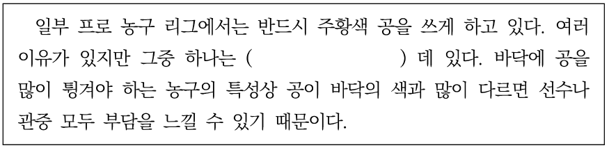 ( )에 들어갈말로 가장 알맞은것을 고르십시오. Chọn cái phù hợp nhất điền vào ( ). 일부 프로 농구 리그에서는 반드시 주황색 공을 쓰게하고있다. 여러 이유가 있지만 그중 하나는 ( ) 데있다. 바닥에 공을많이튕겨야하는농구의특성상 공이 바닥의 색과 많이 다르면 선수나 관중 모두 부담을 느낄수있기때문이다.