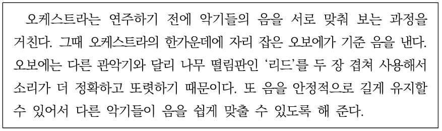 다음을 읽고 글의 내용과같은것을 고르십시오. Đọc và chọn nội dung đúng của bài viết. 오케스트라는 연주하기전에 악기들의음을서로맞춰보는과정을 거친다. 그때 오케스트라의 한가운데에자리잡은오보에가 기준음을낸다. 오보에는다른관악기와달리 너무 떨림판인리드를 좀 두 장 겹쳐 사용해서 소리가 더 정확하고또렷하기때문이다. 또 음을 안정적으로 길게 유지할수있어서 다른악기들이 음을 쉽게 맞출수있도록해준다.