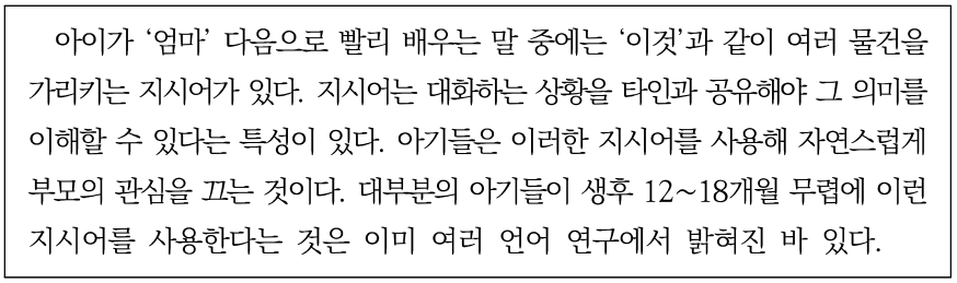 다음을 읽고 글의 내용과같은것을 고르십시오. Đọc và chọn nội dung đúng của bài viết. 아기가 ‘엄마’ 다음으로 빨리배우는말중에는 ‘이것’과 같이 여러물건을가리키는지시어가 있다. 지시어는 대화하는상황을 타인과 공유하며 그 의미를 이해할수있다는특성이 있다. 아기들은 이러한 지시어를 사용해 자연스럽게 부모의 관심을끄는것이다. 대부분의 아기들이 생후 12~18개월 무렵에 이런지시어를사용한다는것은 이미 여러 언어 연구에서 밝혀진바있다.