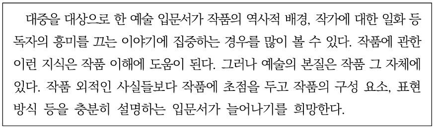 다음을 읽고 글의 주제로 가장 알맞은것을 고르십시오. Đọc và chọn cái phù hợp với chủ đề đoạn văn. 대중을 대상으로 한 예술 입문서가 작품의 역사적 배경, 작가에대한일화 등 독자의흥미를끄는이야기에 집중하는경우를 많이 볼수있다. 작품에관한이런지식은 작품 이해에 도움이된다. 그러나 예술의 본질은 작품 그 자체에 있다. 작품 외적인 사실들보다 작품에 초점을 두고 작품의 구성 요소, 표현 방식 등을 충분히설명하는입문서가 늘어나기를 희망한다.