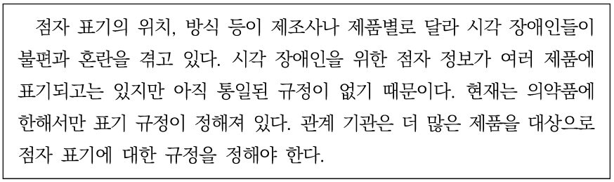 다음을 읽고 글의 주제로 가장 알맞은것을 고르십시오. Đọc và chọn cái phù hợp với chủ đề đoạn văn. 점자 표기의 위치, 방식 등이 제조사나 제품별로 달라 시각 장애인들이 불편과 혼란을 겪고있다. 시각장애인을위한점자정보가 여러제품에표시되고는있지만 아직통일된규정이없기때문이다. 현재는 의약품에 한해서만 표시 규정이 정해져있다. 관계기관은 더많은제품을 대상으로 점자표기에대한 규정을 정해야한다.