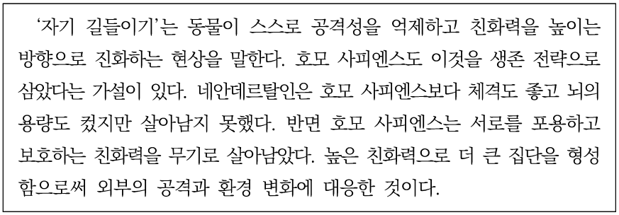 다음을 읽고 글의 주제로 가장 알맞은것을 고르십시오. Đọc và chọn cái phù hợp nhất với chủ đề đoạn văn. ‘자기길들이기’는 동물이 스스로공격성을억제하고친화력을높이는방향으로 진화하는현상을말한다. 호모사피엔스도 이것을생존전략으로삼았다는 가설이있다. 네안데르탈인은 호모사피엔스보다 체격도 좋고 뇌의 용량도 컸지만 살아남지못했다. 반면 호모사피엔스는 서로를포용하고보호하는친화력을 무기로 살아남았다. 높은친화력으로 더큰집단을형성함으로써 외부의공격과환경변화에대응한것이다.