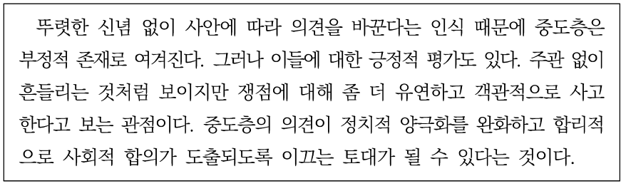 다음을 읽고 글의 주제로 가장 알맞은것을 고르십시오. Đọc và chọn cái phù hợp nhất với chủ đề đoạn văn. 뚜렷한신념없이 사안에따라의견을바꾼다는인식 때문에 중도층은 부정적 존재로 여겨진다. 그러나 이들에대한긍정적평가도있다. 주관없이흔들리는것처럼보이지만 쟁점에대해 좀 더 유연하고 객관적으로사고한다고보는관점이다. 중도층의 의견이 정치적 양극화를완화하고합리적으로사회적합의가도출되도록이끄는토대가 될수있다는것이다.