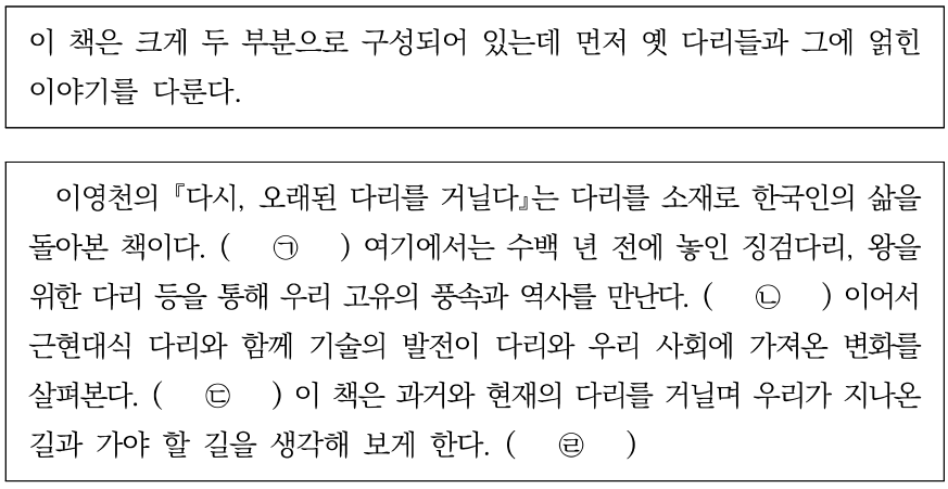 주어진문장이 들어갈곳으로 가장 알맞은것을 고르십시오. Hãy chọn vị trí đúng cho câu: 이 책은 크게 두 부분으로 구성되어있는데 먼저 옛 다리들과 그에얽힌이야기를다룬다. 이영천의 『다시오래된다리를건넌다』는 다리를소재로한국인의삶을돌아본책이다. ( ㉠ ) 여기에서는 수백년전에놓인징검다리, 왕을위한다리등을 통해 우리 고유의 풍속과 역사를 만난다. ( ㉡ ) 이어서 근현대식 다리와 함께 기술의 발전이 다리와 우리 사회에가져온변화를살펴본다. ( ㉢ ) 이 책은 과거와 현재의 다리를 건너며 우리가지나온길과가야할길을 생각해보게한다. ( ㉣ )