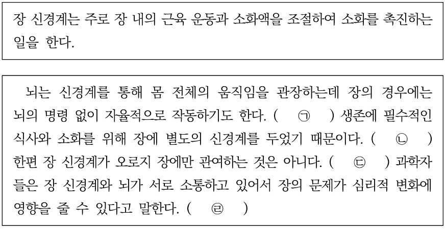 Hãy chọn vị trí đúng cho câu: 장신경계는 주로 장내의 근육 운동과 소화액을 조정하여 소화를촉진하는일을한다. 뇌는 신경계를 통해 몸 전체의 움직임을 관장하는데 장의경우에는 뇌의명령없이 자율적으로 작동하기도한다. (ㄱ ) 생존에필수적인식사와소화를 위해 장에 별도의 신경계를 두었기때문이다. ( ㄴ) 한편 장신경계가 오로지장에만국한되는것은아니다. (ㄷ ) 과학자들은 장신경계가 뇌가 서로 소통하고있어서 장의 문제가 심리적 변화에 영향을줄수있다고말한다. ( ㄹ)