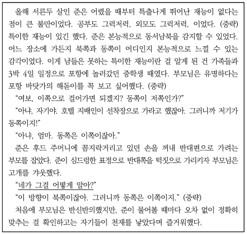 윗글의내용으로알수있는것을 고르십시오. Có thể biết được gì từ bài văn trên. 올해서른두살인준은 어렸을때부터 특출나게뛰어난재능이없다는 점이큰불만이었다. 공부도 그럭저럭, 외모도 그럭저럭, 이었다. (중략) 특이한재능이 있긴했다. 준은 본능적으로 동서남북을 감지할수있었다. 어느 장소에 가든지 북쪽과 동쪽이 어디인지 본능적으로 니낄수있는감각이었다. 이게남들은못하는특이한재능이란 걸알게된건 가족들과 3박4일 일정으로 포항에놀러갔던중학생때였다. 부모님은 유명하다는포항바닷가의해돋이를 꼭 보고싶어했다. (중략) “여보, 이쪽으로 걸어가면 되겠지? 동쪽이 저쪽인가?” “아냐, 자가야. 호텔 지배인이 선착장으로 가라고했잖아. 그러니까 저기가 동쪽이지!” “아냐, 엄마. 동쪽은 이쪽이잖아.” 준은 후드 주머니에 꼼지락거리고있던손을꺼내 반대편으로가려는부모를잡았다. 준이 심드렁한표정으로 반대쪽을 턱짓으로 가리키자 부모님은 고개를 갸웃했다. “네가 그걸 어떻게 알아?” “이 방향이 북쪽이잖아. 그러니까 동쪽은 이쪽이지.” (중략). 처음에 부모님은 반신반의했지만, 준이 물어볼때마다 오차없이정확히맞추는걸확인하고는 자기들이 천재를 낳았다며 즐거워했다.