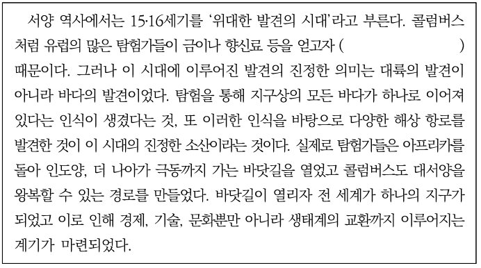 윗글의 주제로 가장 알맞은것을 고르십시오. Chọn cái phù hợp với chủ đề của bài viết sau. 서양 역사에서는 15·16세기를 ‘위대한발견의시대’라고부른다. 콜럼버스처럼 유럽의많은탐험가들이 금이나 향신료 등을 얻고자 ( ) 때문이다. 그러나 이시대에이루어진발견의진정한의미는 대륙의발견이아니라 바다의 발견이었다. 탐험을 통해 지구상의모든바다가하나로이어져있다는 인식이생겼다는것, 또 이러한인식을바탕으로다양한해상항로를발견한것이 이시대의진정한소산이라는것이다. 실제로 탐험가들은 아프리카를 돌아 인도양, 더나아가극동까지가는바닷길을열었고 콜럼버스도 대서양을왕복할수있는경로를 만들었다. 바닷길이 열리자 전세계가 하나의 지구가 되었고 이로인해 경제, 기술, 문화뿐만아니라 생태계의교환까지이루어지는계기가마련되었다.