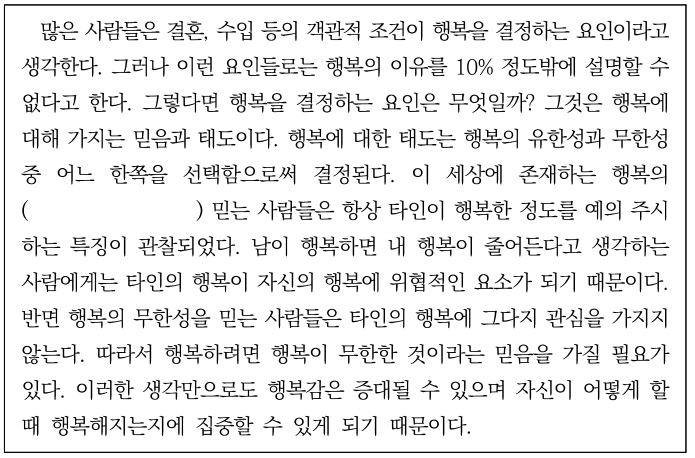 ( )에들어갈말로 가장 알맞은것을 고르십시오. Chọn cái phù hợp điền vào ( ). 많은사람들은 결혼, 수입 등의 객관적 조건이 행복을결정하는요인이라고생각한다. 그러나 이런요인들로는 행복의 이유를 10% 정도밖에 설명할수없다고한다. 그렇다면 행복을결정하는요인은무엇일까? 그것은 행복에대해가지는믿음과태도이다. 행복에대한태도는 행복의 유한성과 무한성 중 어느 한쪽을 선택함으로써 결정된다. 이세상에존재하는행복의 ( ) 믿는사람들은 항상타인이행복한정도를예외로주시하는특징이관찰되었다. 남이행복해하면 내행복이줄어든다고생각하는사람에게는 타인의 행복이 자신의행복에위협적인요소가되기때문이다. 반면 행복의무한성을믿는사람들은 타인의 행복에 그다지 관심을가지지않는다. 따라서 행복하려면 행복의무한한차이라는믿음을 가질필요가있다. 이는 상대적으로 행복을 누릴수있으며 자신의 어떻게할때 행복해지는지에 집중할수있게되기때문이다.
