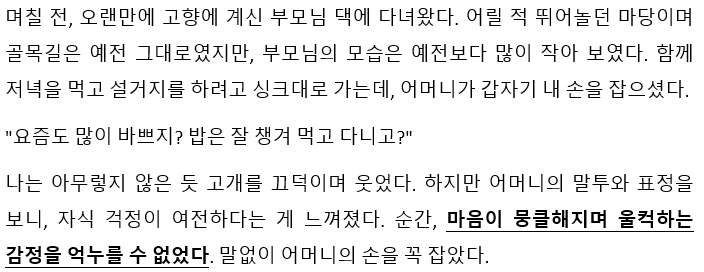 23. 밑줄 친 부분에 나타난 ' 나 ' 의 심정으로 가장 알맞은 것을 고르십시오 .