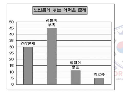 다음은 65세 이상의 노인들이겪는어려운문제들을 조사한것입니다. 노인들에게 가장 어려운문제는 무엇입니까? Sau đây là khảo sát về những thách thức mà người cao tuổi từ 65 tuổi trở lên phải đối mặt. Những vấn đề nào là thách thức lớn nhất đối với họ?