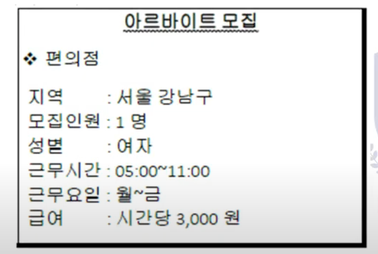다음은 아르바이트를할사람을구하는광고입니다. 다음 중 이일을할수있는사람은 누구입니까? Quảng cáo sau đây đang tìm kiếm người làm việc bán thời gian. Ai trong số những người sau đây có thể làm công việc này?