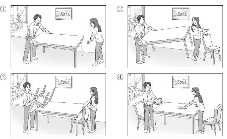 16. 다음 대화를 듣고 알맞은그림을 고르십시오. Nghe đoạn hội thoại sau và chọn tranh phù hợp. 남자: 식탁이 무거운데 같이 좀 들어줄래요? 여자: 네. 제가 여기를들게요.