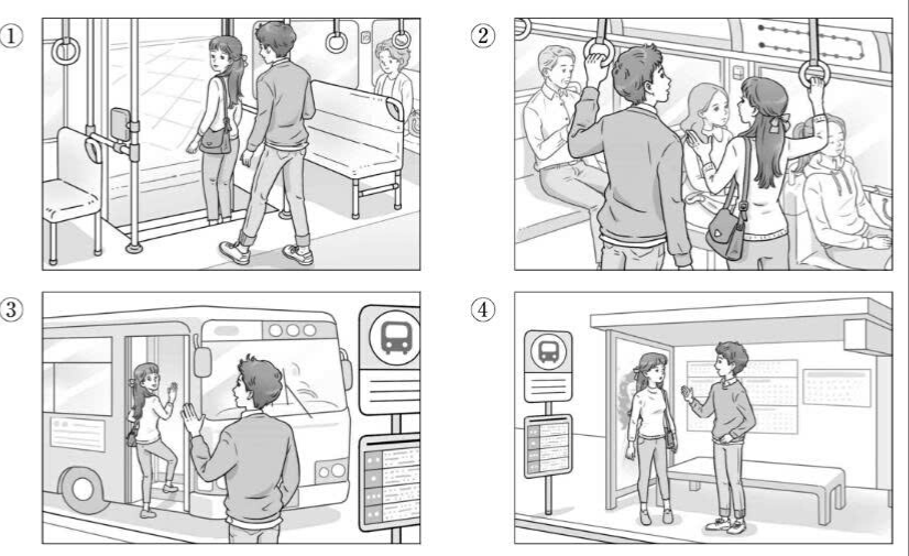 16. 다음을 듣고 가장 알맞은 그림을 고르십시오. (각 4점) Hãy nghe đoạn hội thoại sau và chọn bức tranh phù hợp nhất. 여자: 우리 15번 버스를타지요? 남자: 네. 이 정류장에서 탈수있네요.